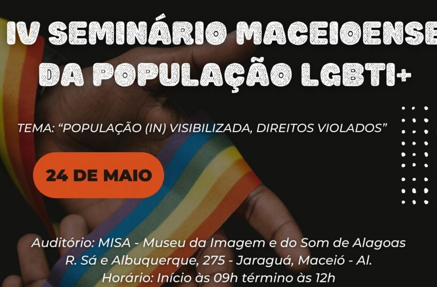 A IV Edição do Seminário Maceioense da População LGBTQIA+ foi remarcada para a próxima terça-feira (24). O evento é promovido pela Coordenação da Diversidade Sexual da Secretaria Municipal de Assistência Social (Semas) e pelo Conselho Municipal de Direitos e Cidadania LGBT (CMDCLGBT) de Maceió, em parceria com a sociedade civil. O seminário vai acontecer no Museu da Imagem e do Som de Alagoas (MISA), no bairro Jaraguá, das 9h às 12h.