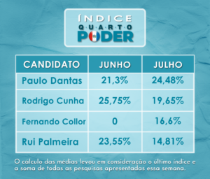 No índice anterior avaliado pelo Quarto Poder Alagoas, Paulo Dantas obteve a menor média no mês passado, 21,3%, atingindo esse mês a liderança também na média do Índice QP, com 24,48%, em segundo lugar Rodrigo Cunha, que mês passado conseguiu manter estabilidade na primeira colocação, com uma média de 25,75%, porém caiu na média desse mês, atingindo o percentual de 19,65%, já Rui Palmeira foi superado por Fernando Collor, mesmo recente na corrida pelo governo do estado, acumulou uma média de 16,6%, ocupando o terceiro lugar do pódio que pertencia anteriormente a Palmeira, sua média que acumulou um índice de 23,55% no mês anterior, neste mês caiu para 14,81%, largando-o no último lugar entre os principais candidatos.