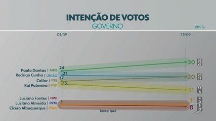 A pesquisa mostra Paulo Dantas (MDB) na liderança, na estimulada ele vem com 30% das intenções de voto, enquanto Rodrigo Cunha (UB) segue estabelecido na segunda colocação com 20%, ainda efeito do apoio do prefeito de Maceió, JHC, que entrou de cabeça na campanha de Cunha. Fernando Collor (PTB) empata com 20%, mas possui a maior rejeição de todos, 41% dos entrevistados não votariam de jeito nenhum no candidato, seguindo no mesmo percentual da pesquisa do dia 1 de setembro, Rui Palmeira (PSD) cai para 11%.