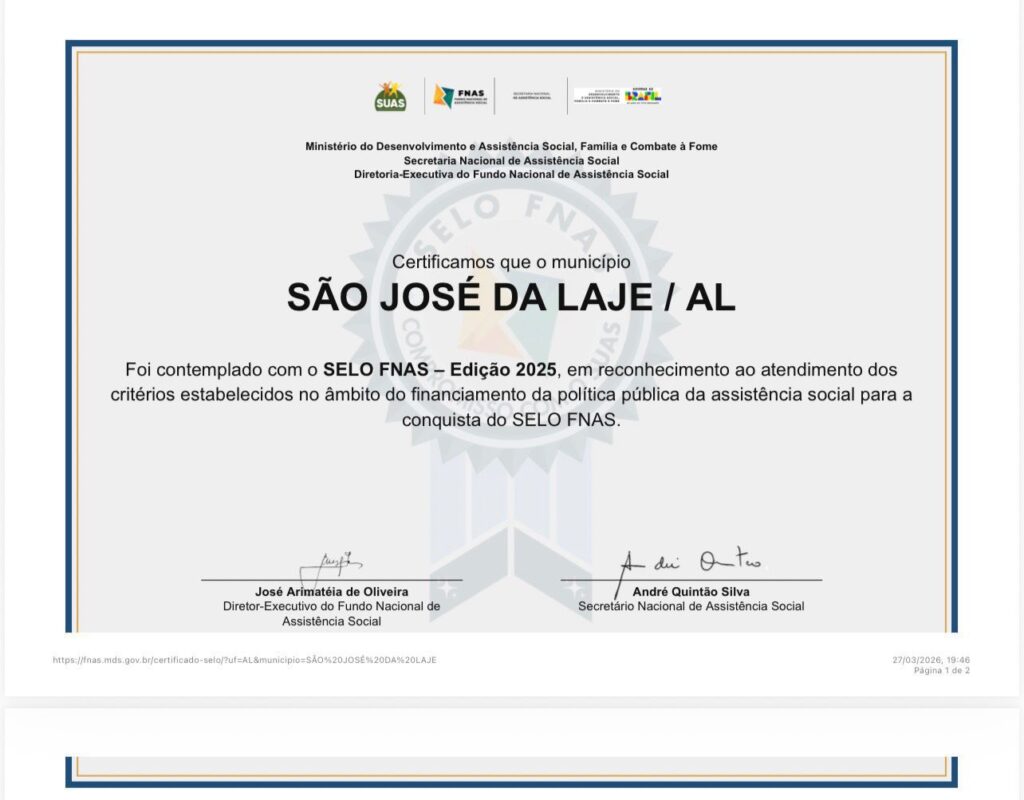 O município de São José da Laje foi contemplado com o Selo FNAS – Edição 2025, uma das principais certificações da assistência social no Brasil. O reconhecimento é concedido a gestões que demonstram compromisso com a correta aplicação dos recursos do Sistema Único de Assistência Social (SUAS).